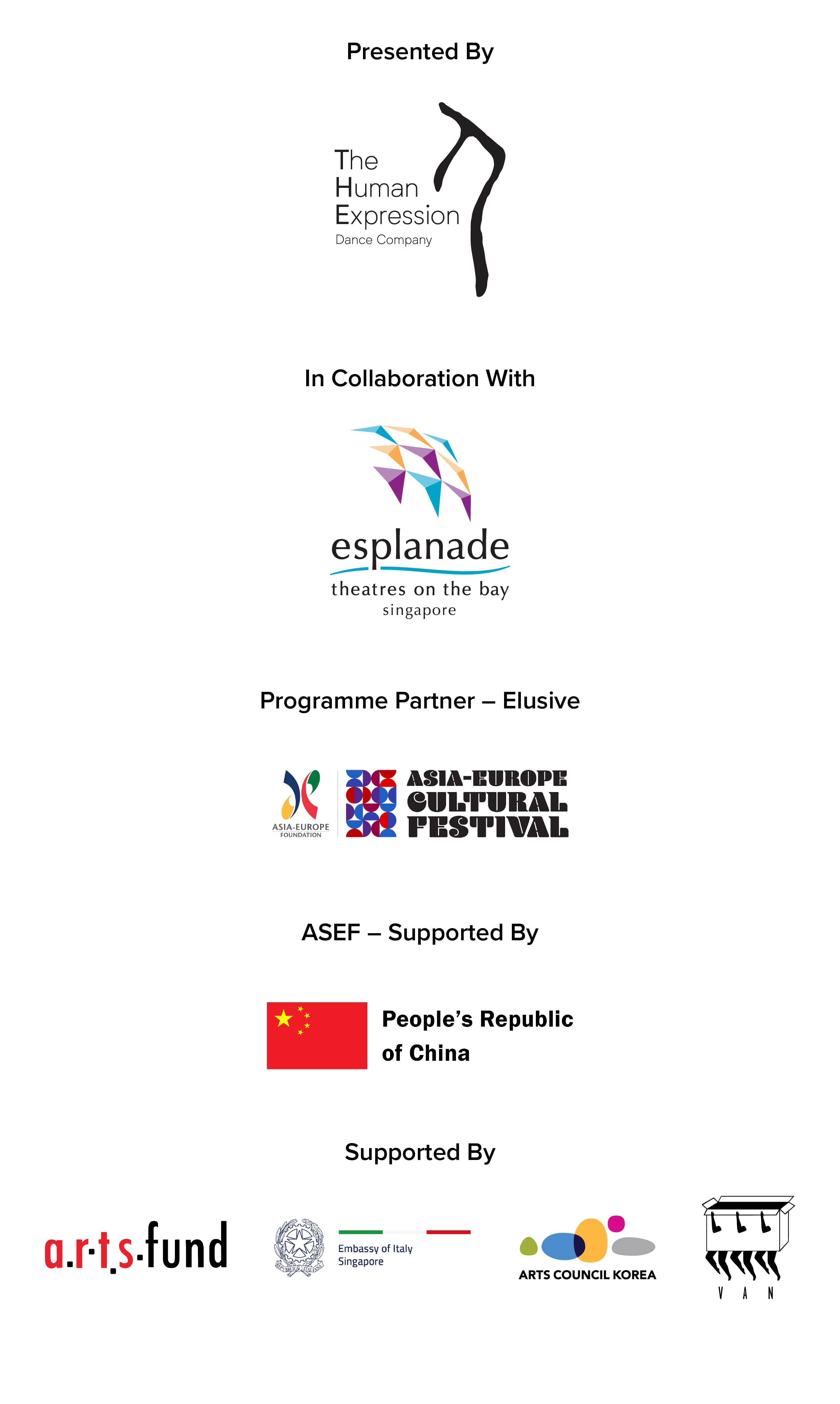 Elusive is presented by T.H.E Dance Company as part of cont·act Dance Festival in collaboration with Esplanade – Theatres on the Bay. The event is also included in the Asia-Europe Cultural Festival 2026 – Closing Curtain, organised by Asia-Europe Foundation (ASEF).